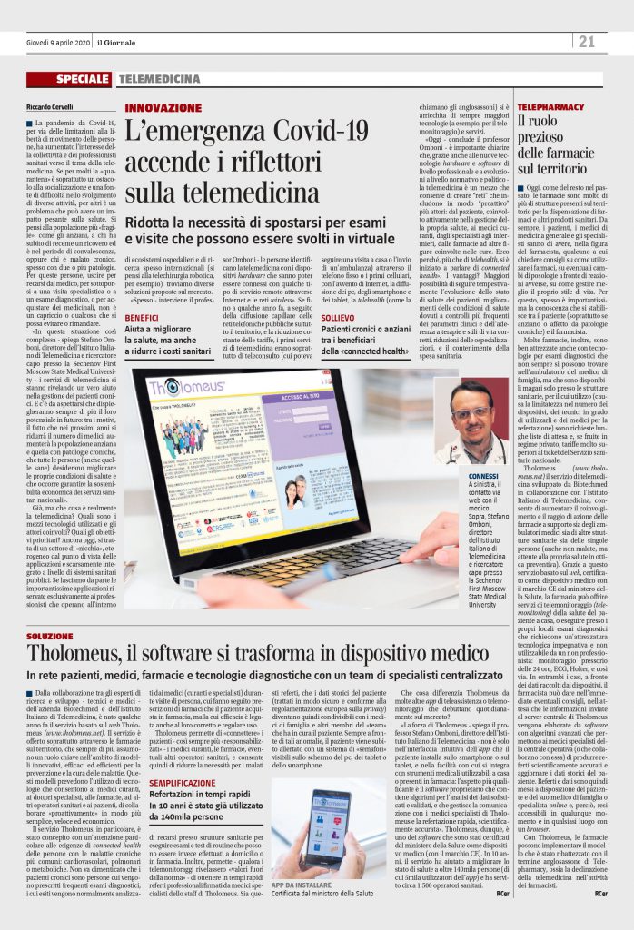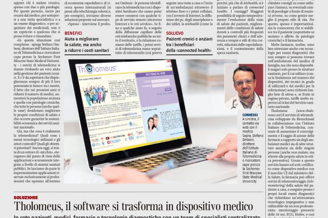 metaboliche, a cui vengono prescritte con più frequenza esami diagnostici. Negli ultimi 10 anni più di 140 mila persone grazie a questa opportunità hanno migliorato notevolmente il proprio stato di salute. Tholomeus® garantisce una connessione costante tra medici e pazienti, consentendo a questi ultimi di limitare al massimo la loro presenza presso le strutture sanitarie per effettuare esami o test che, in questo modo, possono essere eseguiti a casa. “La forza di Tholomeus® – rivela il professor Omboni – non è solo nell’interfaccia intuitiva dell’app che il paziente installa sul proprio smartphone o sul tablet e nella facilità con cui si integra con strumenti medicali utilizzabili a casa o presenti in farmacia, ma è anche il software proprietario che contiene algoritmi per l’analisi dei dati sofisticati e validati, e che gestisce la comunicazione con i medici specialisti di Tholomeus e la refertazione rapida, scientificamente accurata”.