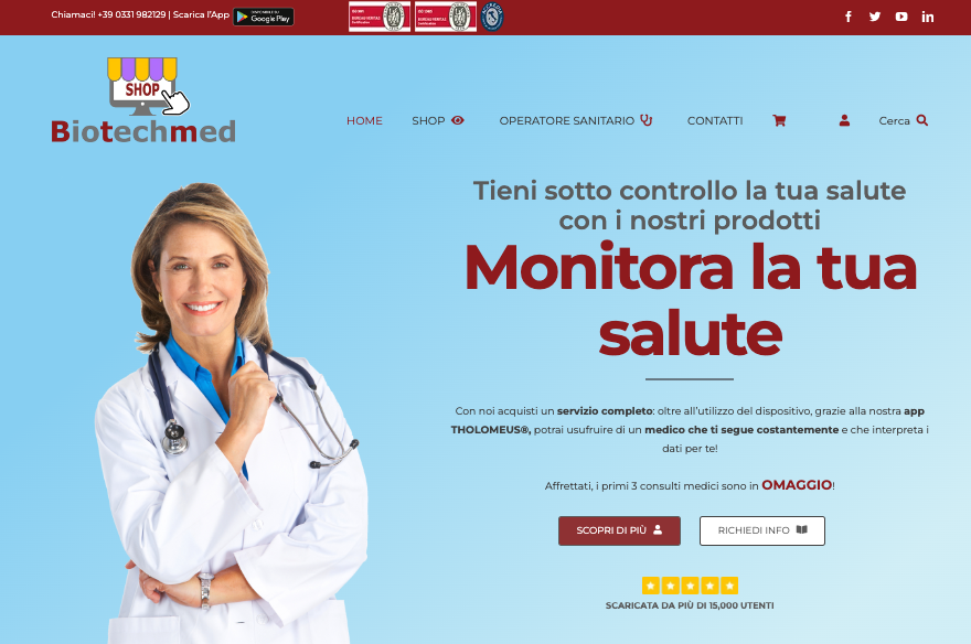In quest’ottica Biotechmed ha recentemente sviluppato una versione del sito dedicata all’e-commerce che propone, oltre ai servizi per gli operatori sanitari, anche una serie di servizi domiciliari pensati per offrire al paziente un pacchetto comprendente dispositivo (misuratore di pressione, elettrocardiografo monocanale, pulsossimetro, termometro) congiuntamente al consulto medico da remoto.