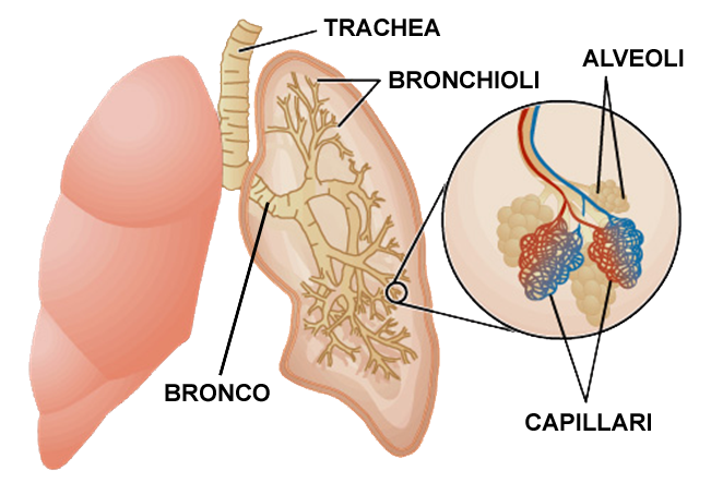 Con la respirazione, l’aria che inspiriamo, carica di ossigeno, entra nel nostro organismo attraversando le vie aeree (faringe, laringe, trachea e bronchi), fino a raggiungere i polmoni. Questi sono formati da una miriade di piccole unità, gli alveoli polmonari, circondati da grovigli di vasi sanguigni (capillari).