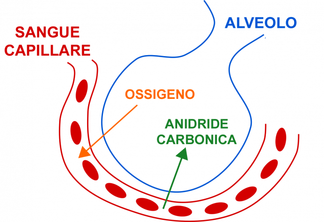 Lo scambio gassoso avviene tra l’aria nei polmoni e il sangue che circola tra un alveolo e l’altro. L’ossigeno contenuto nell’aria inspirata entra così nel circolo sanguigno, mentre l’anidride carbonica viene rilasciata negli alveoli e quindi espirata dai polmoni, ripercorrendo in senso inverso le vie respiratorie fino all’esterno del corpo. L’ossigeno viene catturato dal sangue grazie all’emoglobina, una proteina contenuta nei globuli rossi, con una struttura chimica adatta al legame con l’ossigeno. L’emoglobina permette quindi di trasportare e rilasciare l’ossigeno attraverso il sangue a tutti gli organi e i tessuti del corpo.