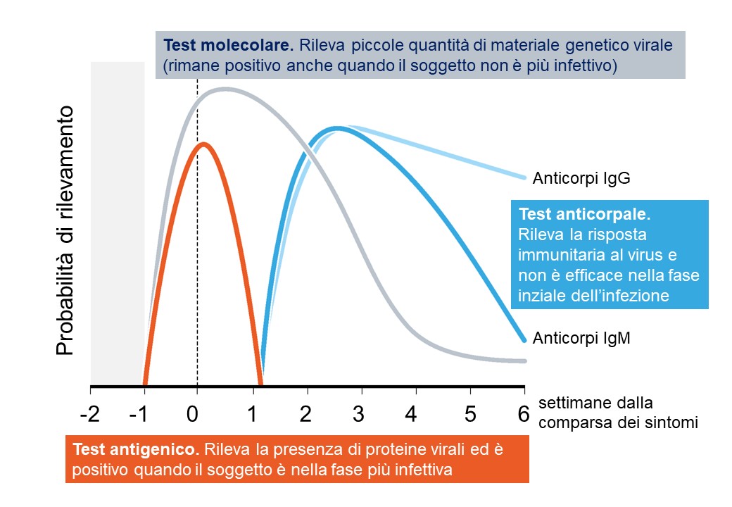 La figura [fonte Nature 2020;(585):496-498] riassume, in maniera semplice e intuitiva, la capacità dei vari test descritti precedentemente di rilevare con accuratezza l’infezione nelle sue varie fasi. E’ indubbio che il test molecolare rappresenti il test diagnostico di elezione.